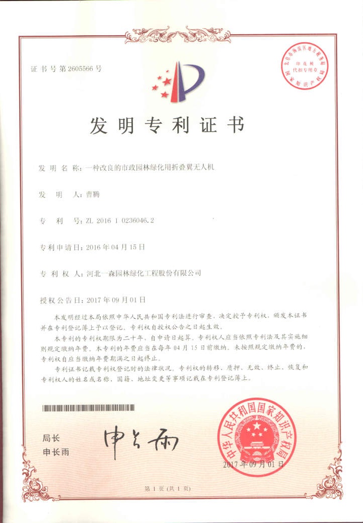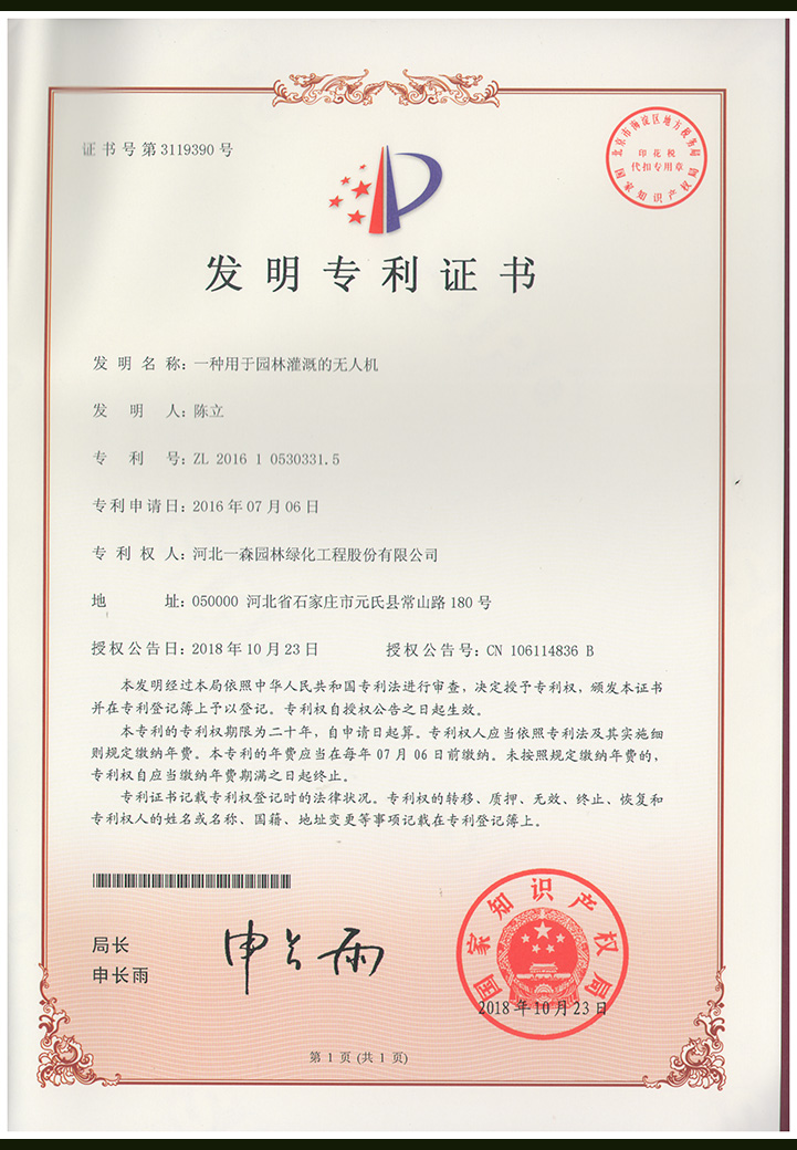“一種用于園林灌溉的無人機”發(fā)明專利證書