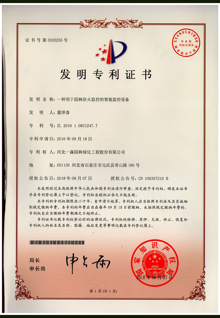 “一種用于園林防火監(jiān)控的智能監(jiān)控設(shè)備”發(fā)明專利證書